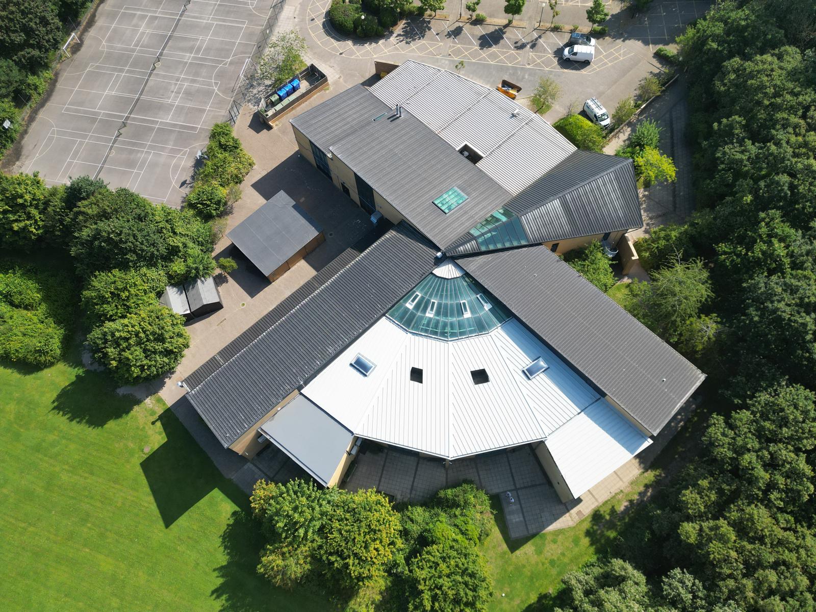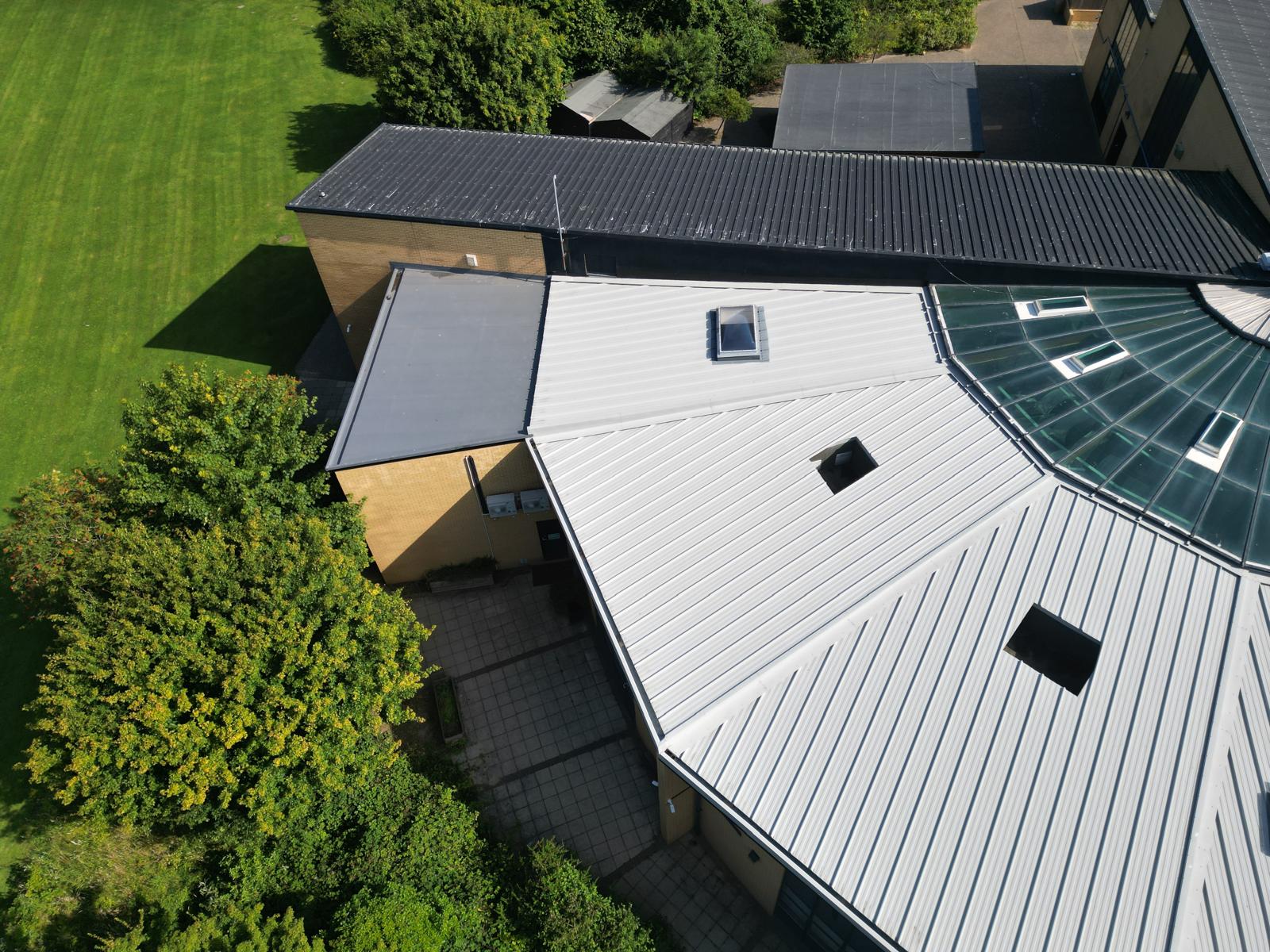 Project at Benjamin Britten School Lowestoft consists of the removal of existing Rigidal Ziplok 400 roof coverings and replacement with new Euroclad SF500 roof system including new Whitesales rooflights.